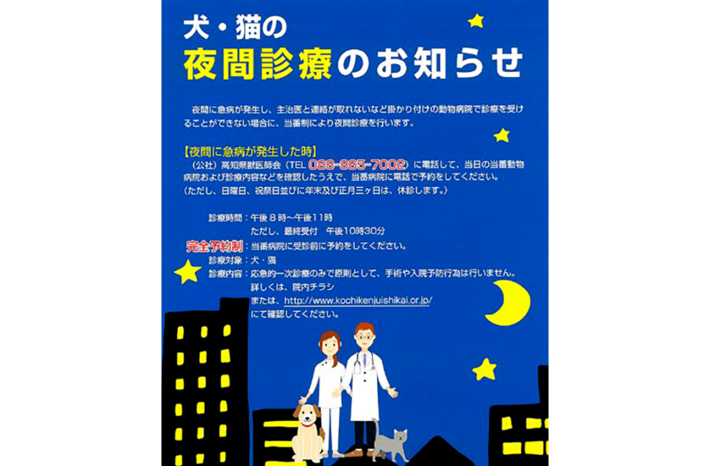 高知県獣医師会の有志が当番制で行っている犬猫の夜間診療です。当院も開業当初から参加しています。