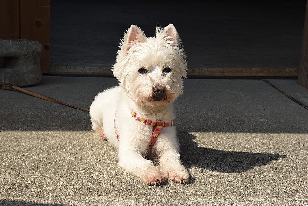 そこからずっと、ロニーは私の獣医師人生を共に生きてきた同胞のような存在でした。幼齢期はアトピー性皮膚炎で週2回の自宅シャンプーが欠かせず、さらに色々なものを破壊する激し目の問題行動にも悩まされ、私は獣医師として飼い主側の気持ちを経験すると共に、今でも活かされている貴重な勉強を彼女からさせてもらったと思います。また、過去には大学生への講義・実習のデモ犬や輸血の供血犬としても登場し、多くの人の役に立ってきた犬でした。晩年はほとんど両親の家で静かな余生を過ごしていたため病院犬としての姿はあまり知られていませんが、開業時は医療機器の動作確認や健診のデモなど病院への貢献度が高い仕事をしてくれました。人や動物に対して興味が薄く、常に我が道を行くウェスティの個性を色濃く残した犬でした。私を飼い主と認識していたかどうかも疑わしかったのですが、彼女と過ごした月日は決して忘れないと思います。