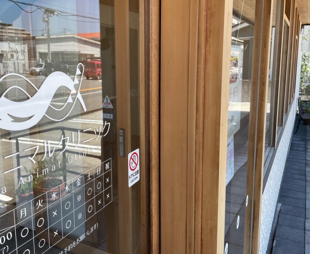 当院を5年前に建設する際に正面(建築の世界ではファザードと呼ぶそうです)のデザインについて悩みました。最終的に病院の雰囲気と調和するように、木材を無垢(素材のまま)で使用することにしました。したがって、当院の待合室道路側の柱は全て檜の無垢材です。あれから5年が経過し、無垢材の欠点である対候性の低さが露呈、特に自動ドア周辺は雨風や日光に晒されるため老朽化に伴う色調の変化や黒いシミが目立つようになりました。