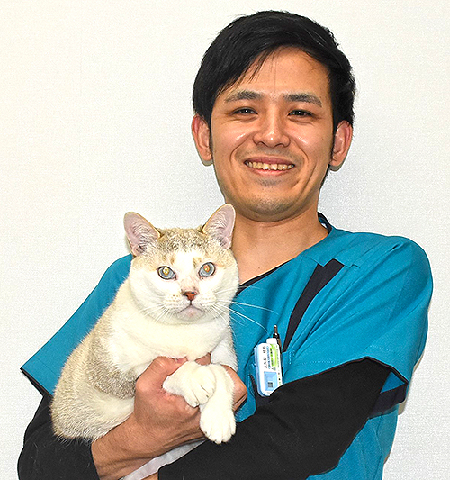 さて、当院では11月から動物看護師1名を雇用しました。大久保桂佑(おおくぼ けいすけ)さんです。動物看護師は今年に入って国家資格化が法的に決定したことを受け、今後は動物医療において重要な役割を担うことが期待されています。大久保さんには動物看護の専門家として動物医療に携わるほか、飼い主様のお悩みや困り事の頼れる相談役の一人としてその能力を発揮していただきたいと思います。写真は大久保さんと病院猫のキズ君です。