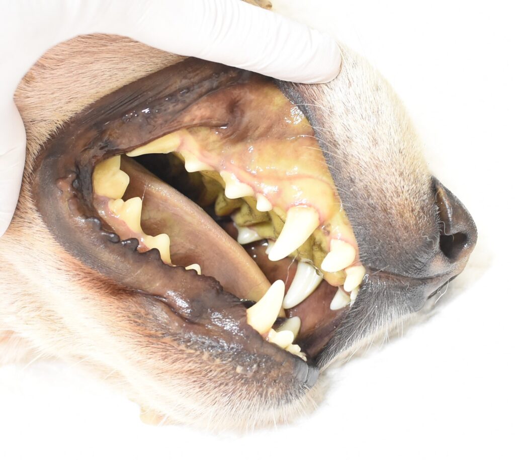 図1. レプトスピラ症による粘膜の黄色変化(黄疸)