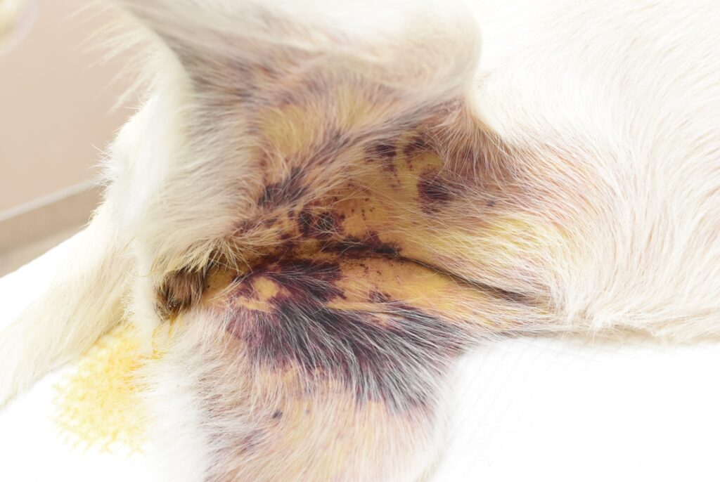 図2. 血液を固めて止血する能力が低下して生じる内出血(紫斑)