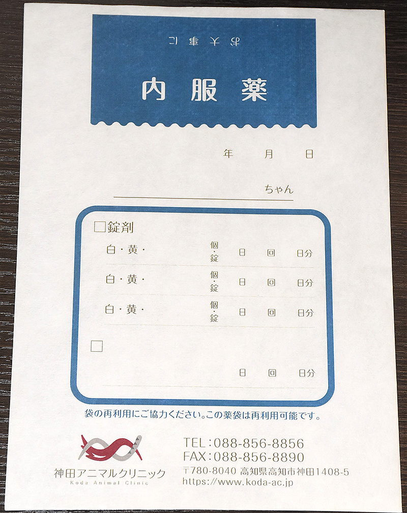 以前にお渡しした薬袋を再びご持参いただいた際には受付時にスタッフへお渡しください。表記を変更して大切に再利用させていただきます(新しいものへの交換はこちらで判断いたします)。