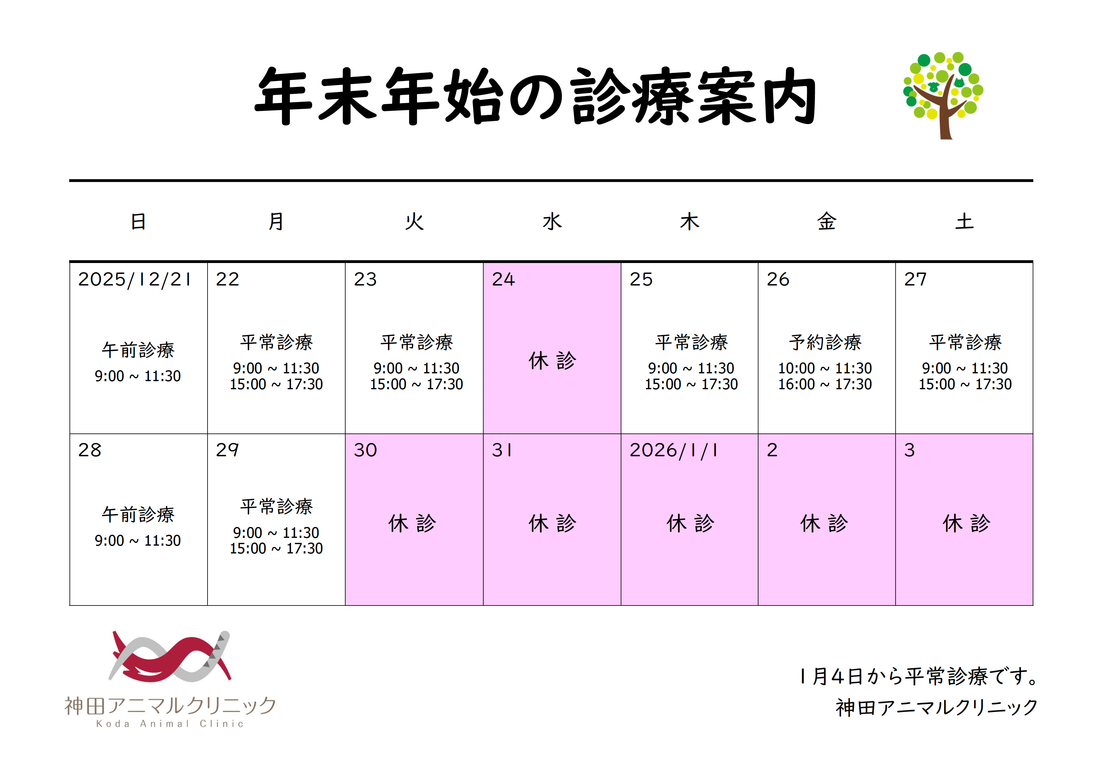 - 12月24日(金)の臨時休診 & 年末年始の診療予定